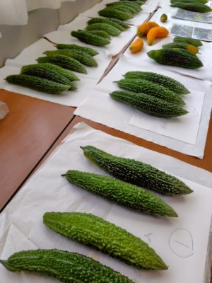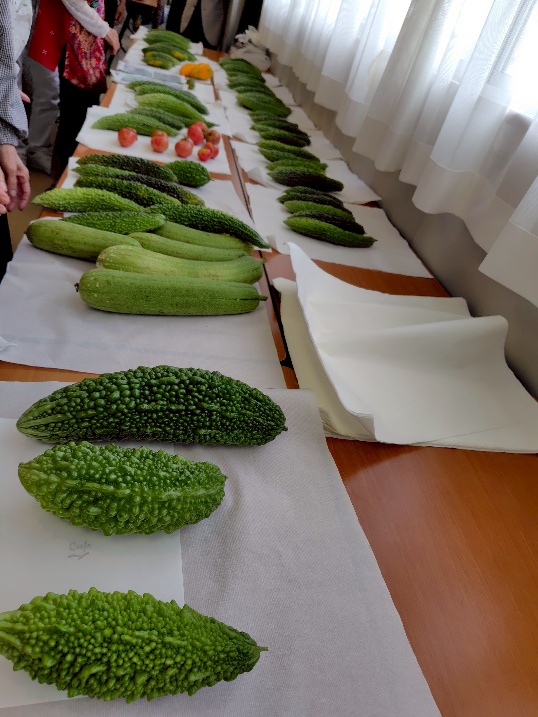 私たちも今回初めて参加させていただいたので、参加前は「ゴーヤ品評会とは…?」と、あまり想像がつかなかったのですが、出品者が自分で育てたゴーヤを収穫して持ち寄り、会の参加者全員で出品されたゴーヤを評価し順位をつけるという品評会でした。