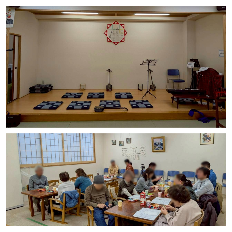 今回お借りしたのは1階の舞台付きの和室で、部屋の前半分は畳、後ろ半分はテーブルと椅子が並べられるスペースがあります。