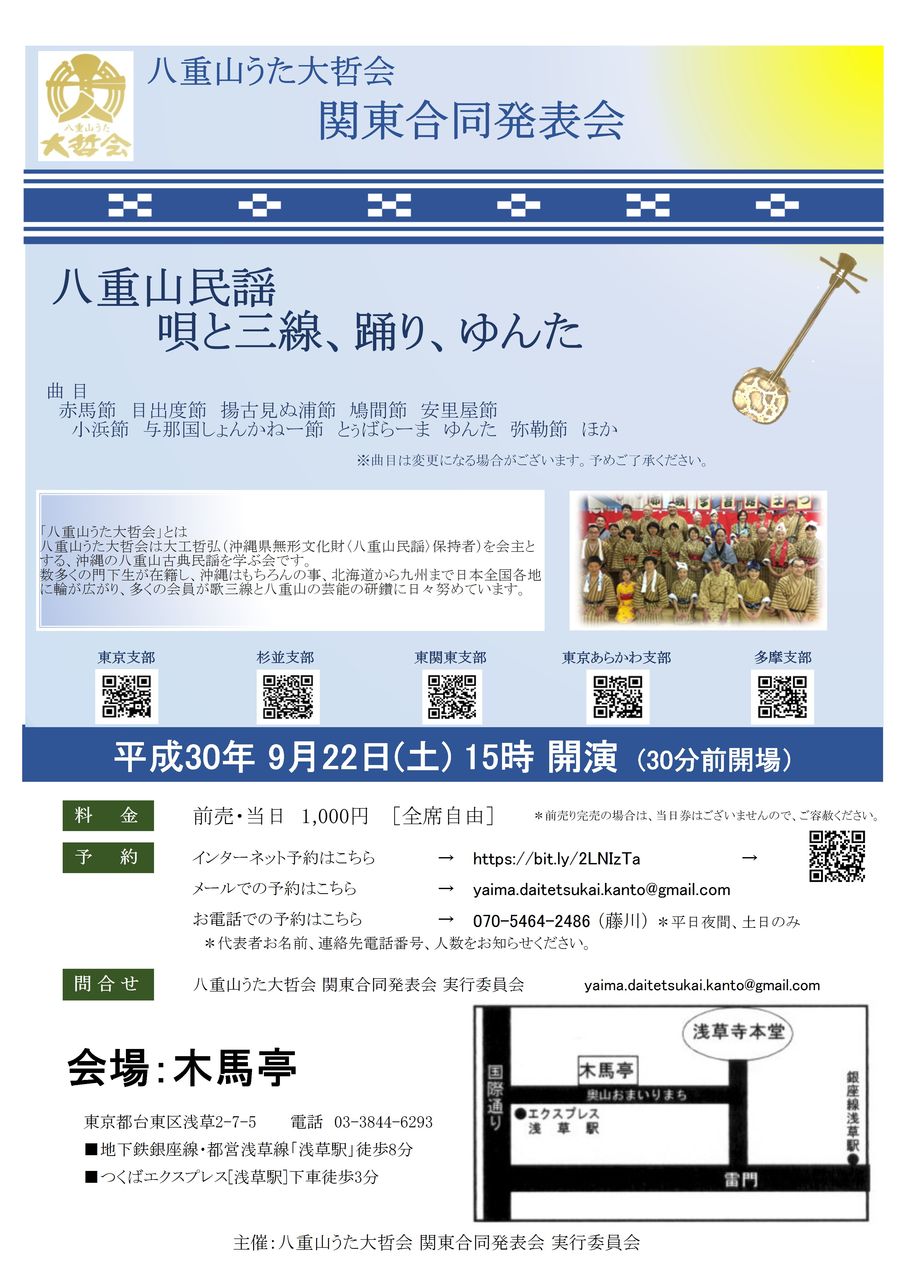 9/22(土)に八重山うた大哲会の関東エリア5支部(東京支部、東関東支部、杉並支部、多摩支部、東京あらかわ支部)による発表会を行うことが決まりました。
